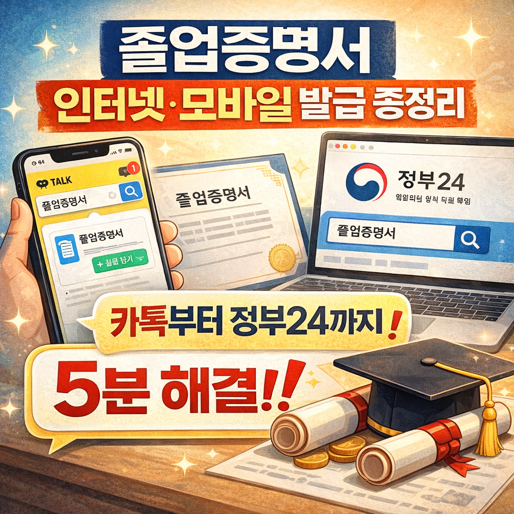 졸업증명서는 보통 '최근 3개월 이내 발급분'을 요구하므로 제출 전 유효기간을 반드시 확인하세요. 2026년 현재는 카카오톡 전자증명서의 활용도가 매우 높으므로, 이동 중에 스마트폰으로 미리 발급받아 두는 것을 추천합니다.
